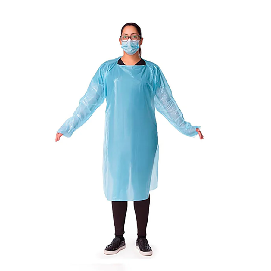 Pechera o delantal de polietileno desechable?azul usado en actividades para proteger la ropa, como uniforme o por razones de higiene o asepsia.